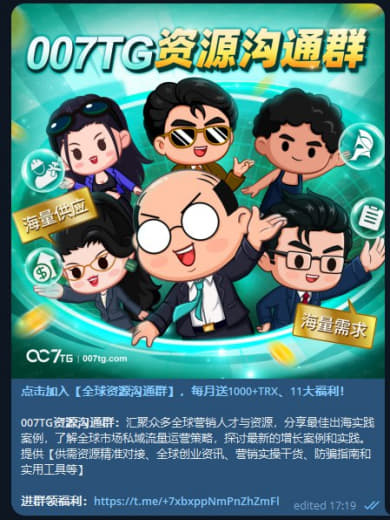 007TG资源沟通群:汇聚众多全球营销人才与资源,分享最佳出海实践案例,了解全球市场私域流量运营策略,探讨最新的增长案例和实践。提供【供需资源精准对接、全球创业资讯、营销实操干货、防骗指南和实用工具等】
